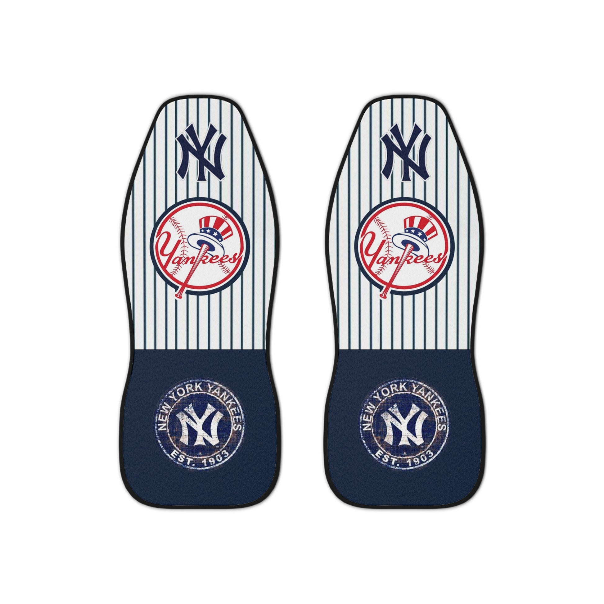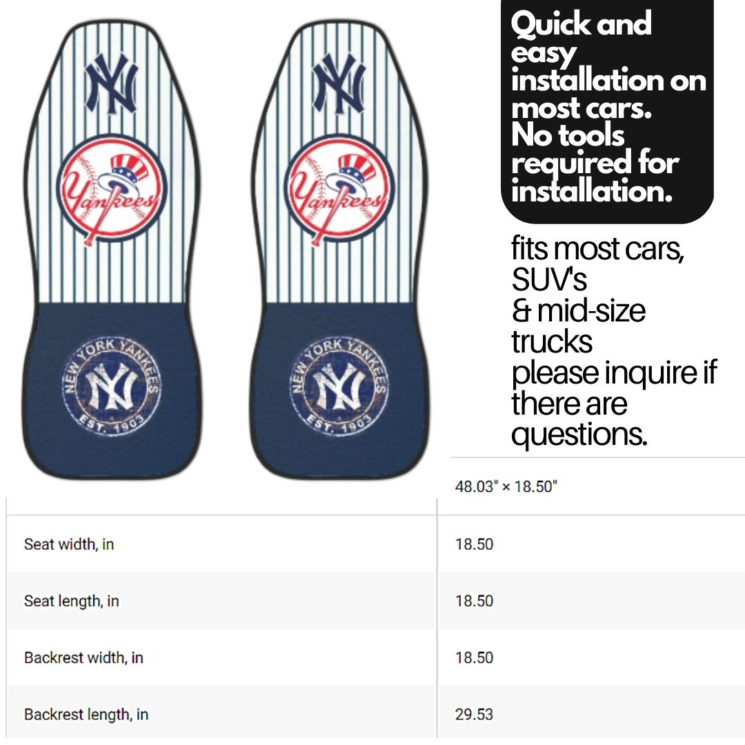 Cute, cool FAN-TASTIC are the NY Yankees Pinstriped car seat covers. Put the Ultimate Fan spin on any car with these awesome personalized NY Yankees car seat covers. Made with thick polyester fabric for seat protection and added comfort. These striped white & navy Yankees car seat covers are truly the perfect way to make your drives more exciting. It may even help brighten your mood in your daily life. Made with top-tier, thick polyester fabric for long-lasting durability. These Bronx Bombers seat covers come with an elastic fastening system that delivers a secure, snug fit that is tool-free and easy to install. Both seat covers feature identical designs. - High quality thick polyester fabric; 29.98 Oz. - One set contains TWO seat covers - Identical designs printed on both covers - Black back cover - Dimension(seat): 18.50"(L)*18.50"(W); Dimension(backrest): 29.53"(L)*18.50"(W) - Quick and easy installation on most car. No tools required for installation. - Back of covers offer an elastic fastening system for a secure and snug fit. - Protect your seats from spills, tearing and fading. - Hand wash. The print on car seat covers is unable to fade. - WARNING: These car seat covers should NOT be used on a seat with side airbags.